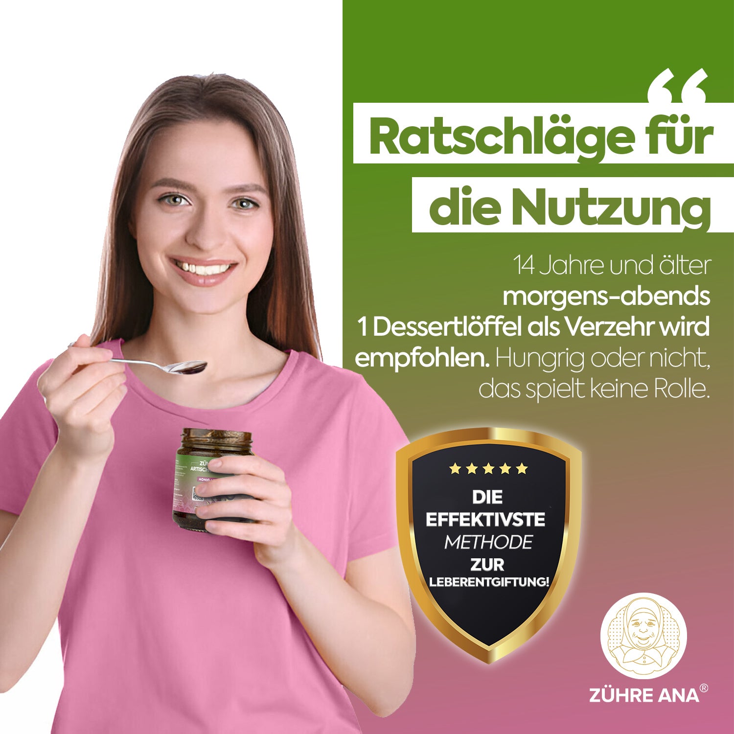 Zusammensetzung: Honig, Maulbeerpekel (Dut Pekmezi), Enginarextrakt (%11), Devedikeni Samen, Grüner Tee, Frenk Kimyon, Knoblauchblätter, Brokkoli, Kurkuma.