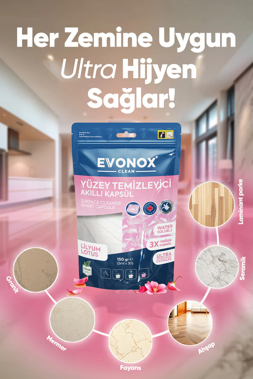 - Lilyum ve Lotus kokusuyla zenginleştirilmiş Evonox Clean Yüzey Temizleyici Akıllı Kapsül, evinizdeki her köşeye ferahlık katıyor.