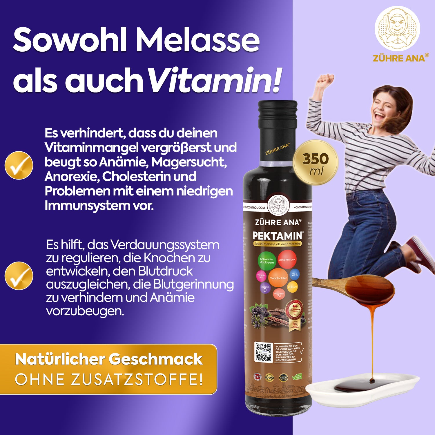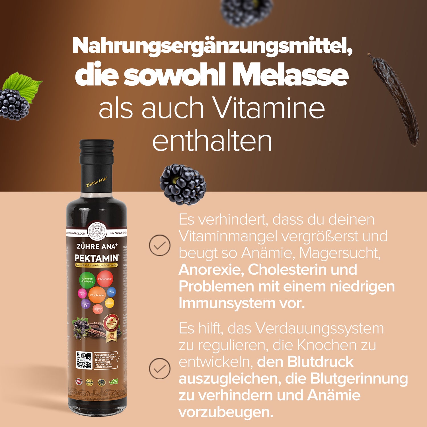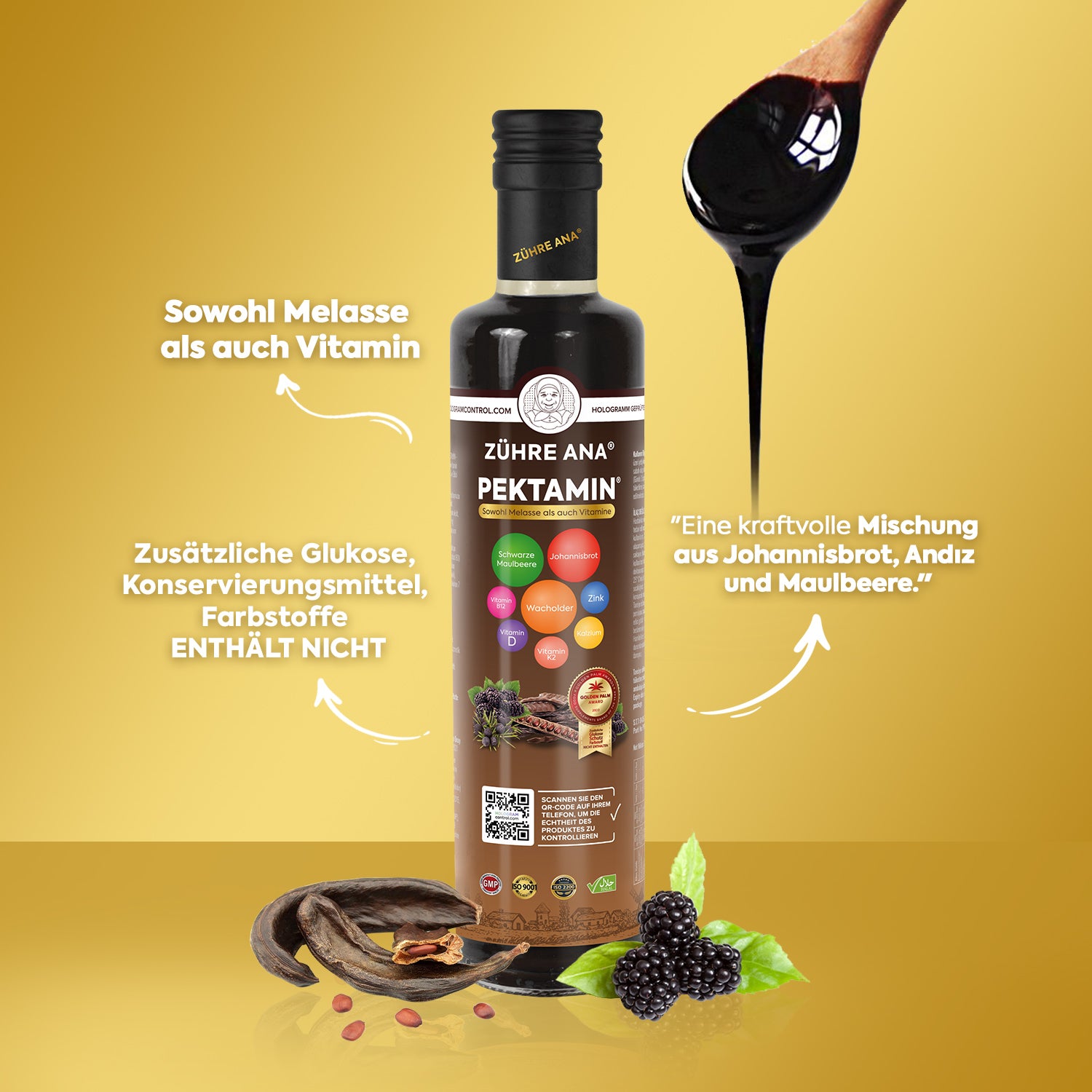 Karadut, keçiboynuzu ve andız pekmezi ile zenginleştirilmiş bu özel karışım; bağışıklığı destekler, kansızlığın önüne geçer ve enerji verir. Bağırsak hareketlerini düzenler, enfeksiyonlara karşı vücut direncini artırır.